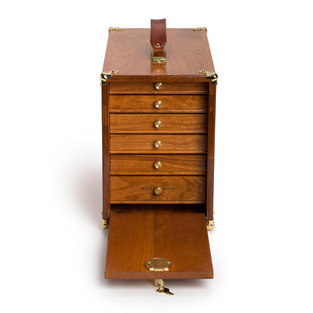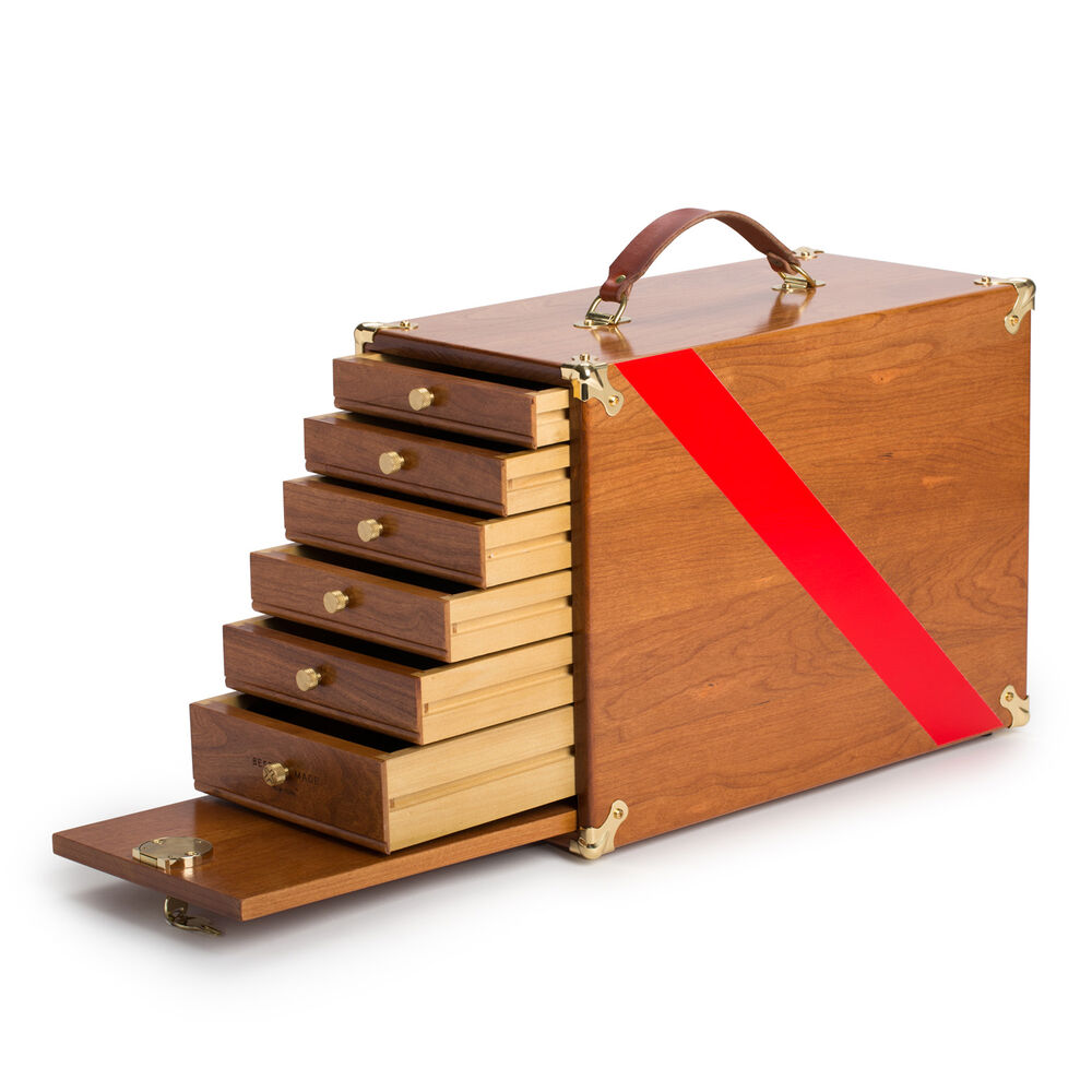 Built by esteemed American casemakers Gerstner & Sons, the original plans of the Gerstner 25 were lost in a 1913 flood. Reengineered exclusively for Best Made Co., the Gerstner 25X carries a legacy of orderly workmanship. With an indexing series of drawers, a valued set of precision tools or a lifelong collection of keepsakes can be stored neatly and secured with a locking front panel. Hand-finished American cherry and polished brass hardware make a worthy home for the most valued contents. The painted red side-sash, emblazoned on both sides, is a handsome flourish for any shelf. Custom felt lining, knurled brass knobs and our iconic “Be Optimistic” embroidery are a few testaments to the intricacy of detail. With lock-rabbet joinery and poplar drawer bases for stability, the Gerstner 25X is built for elegance and lifelong service. Once the highest badge of honor for the American mechanic and typesetter, the Gerstner 25X is an enduring symbol of quality and craftsmanship.